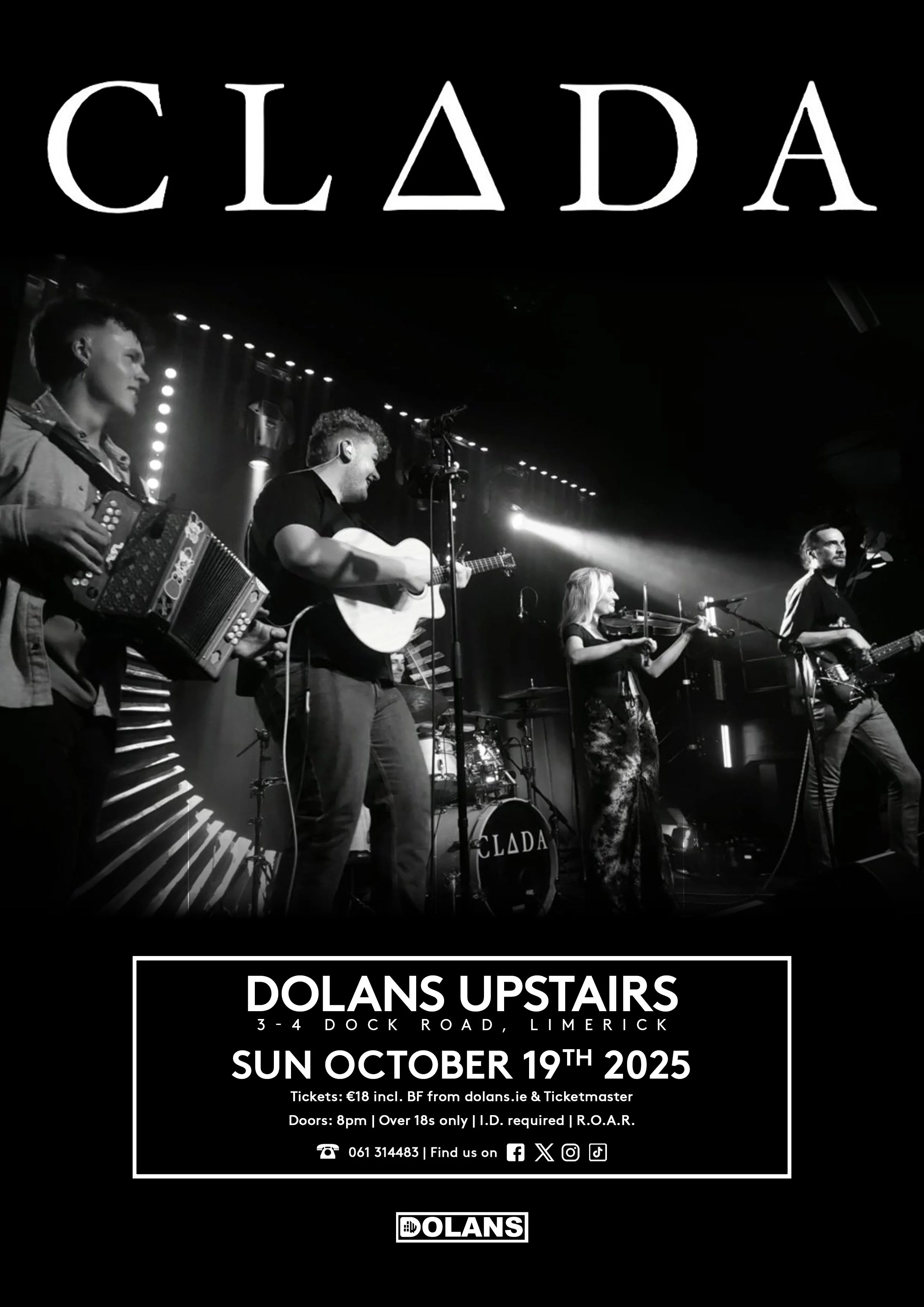 Hailing from Connemara, CLADA are a five-piece making waves on the music scene with their mix of trad, funk, folk, bluegrass and dance music. Formed in late 2023, the group features Orla Leavy (fiddle), Sam Carey (guitar), Liam Tierney (accordion), Sam Purcell (drums), and Eoin Salmon (bass). CLADA bring a fresh energy, balancing reverence for tradition with a playful, modern twist. They recently completed their first Irish tour and have garnered a strong social media following.