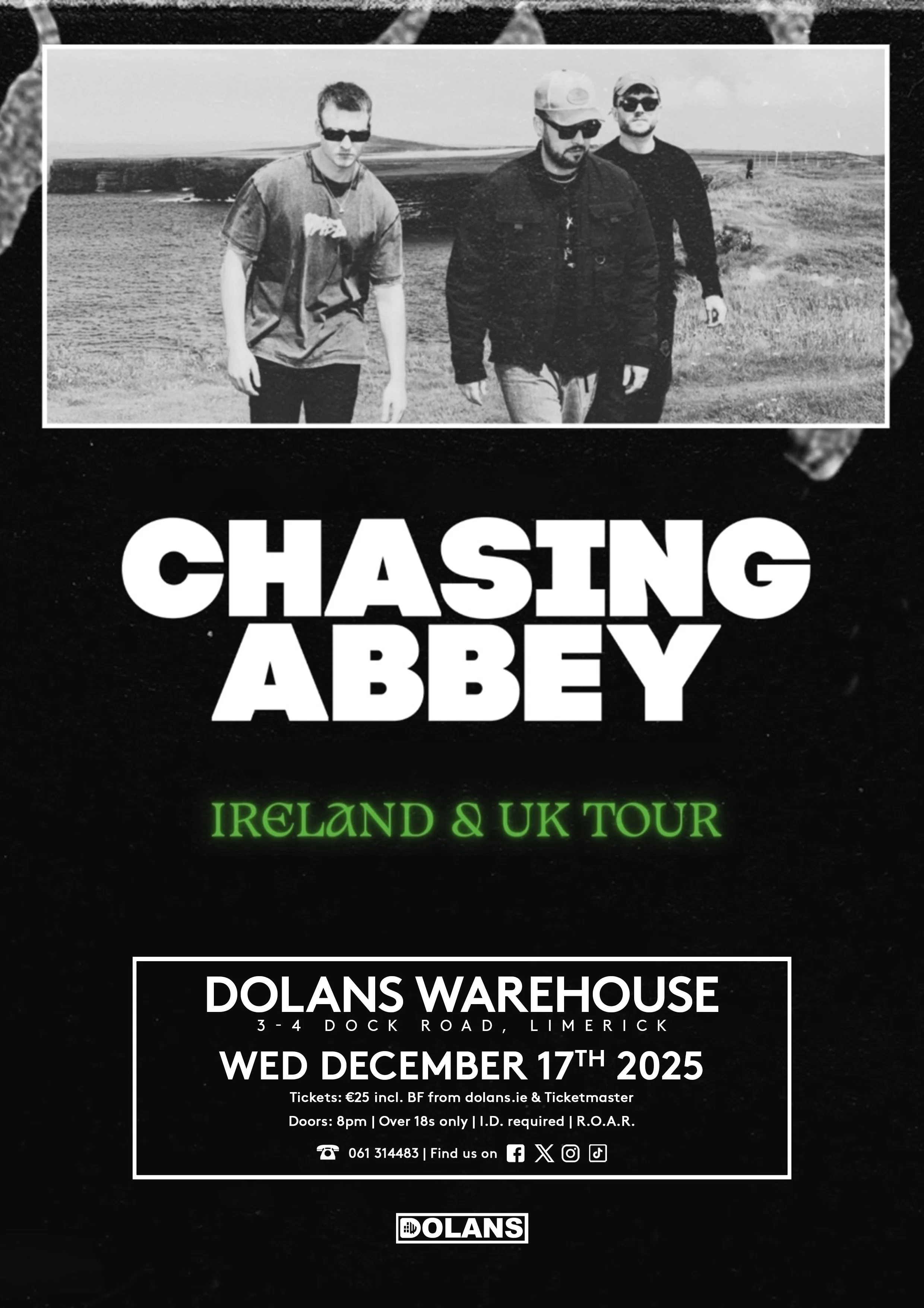 Chasing Abbey are an award-winning trio from Tullamore, Ireland - songwriters, producers, and musicians with multiple platinum singles to their name. Famed for their high-energy shows, they’ve filled venues and festivals across Ireland and earned a reputation for electrifying performances. Their latest release, Arís is Arís, is gaining serious momentum and climbing the charts, further cementing their status as one of Ireland’s most renowned acts. Get ready for a night of unstoppable energy and anthems.
