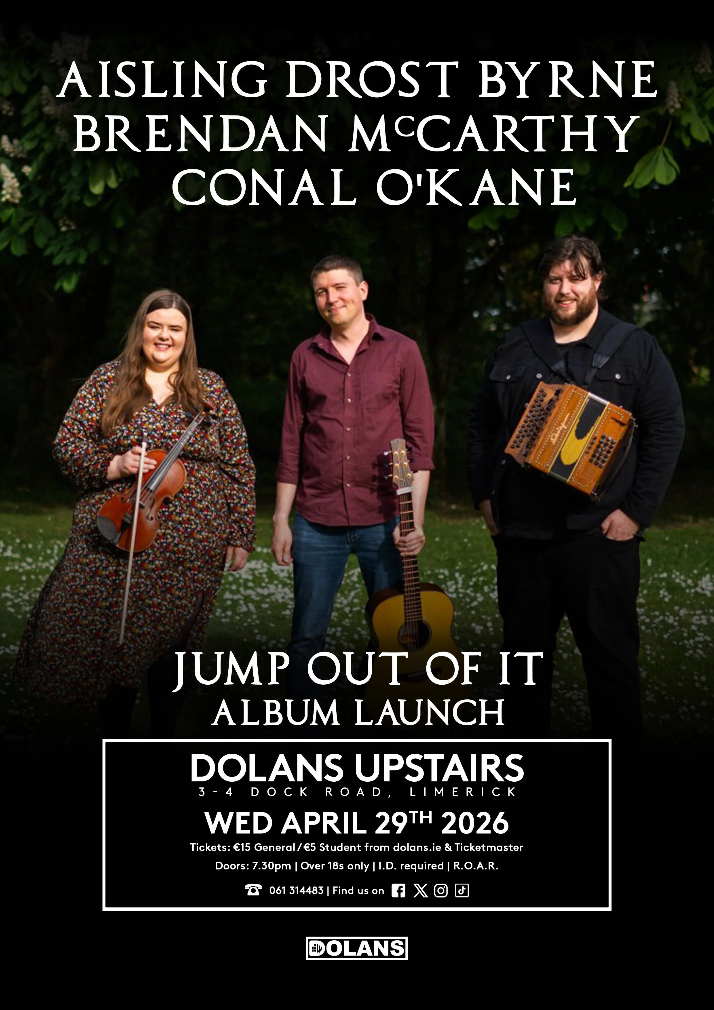 Aisling Drost Byrne, Brendan McCarthy, and Conal O'Kane are graduates of the prestigious Irish World Academy of Music and Dance in the University of Limerick, and each is highly regarded for their unique take on their instrument. Hailing from the strong Donegal fiddling tradition of Glencolmcille, Aisling is a fiercely rhythmic player with a wealth of uncommon fiddle tunes from South-west Donegal. From the opposite end of the country, Brendan McCarthy grew up in the heart of Sliabh Luachra, and his grounding in the music of his local area has been complimented by his immersion in the accordion styles of modern English masters. Finally, Conal O’Kane, originally from Philadelphia, is one of the most sought after guitar players in the tradition, known for his work with Martin Hayes and the band Goitse, among many others. Conal brings a deep knowledge of theory and powerful driving accompaniment to the trio. Aisling, Brendan and Conal released their first trio album 'Jump Out of It' in November 2025.