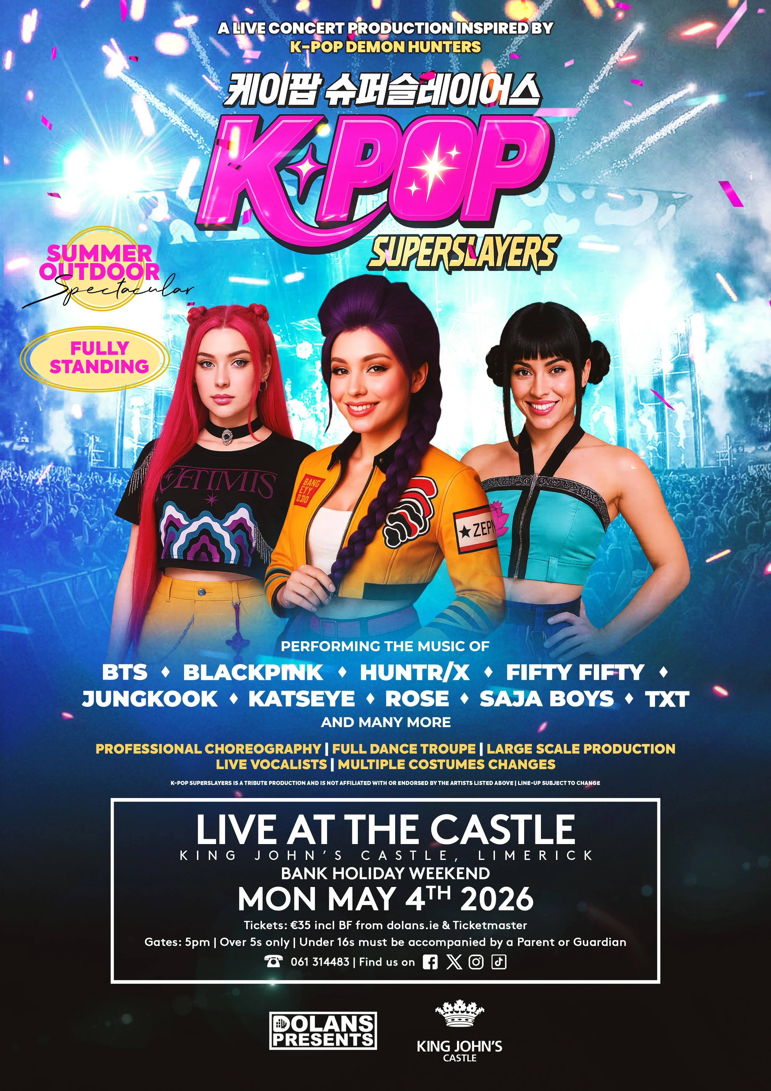 K-POP SUPERSLAYERS LIVE! — the ultimate K-Pop experience — comes to Limerick with a spectacular open-air performance at King John’s Castle, on Monday, May 4th, 2026 (Bank Holiday Weekend).