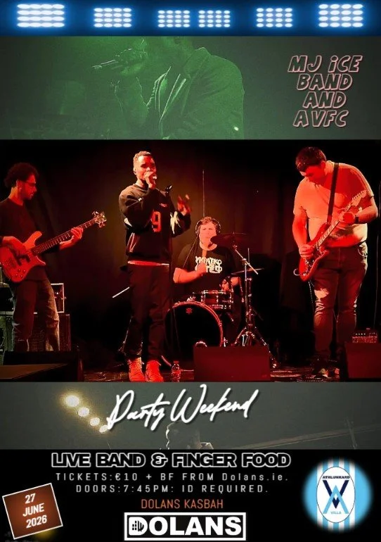 MJ ICE band is limerick local band founded by Justice Mjr AKA J ICE who was solo artist for 7 years then formed MJ ICE band which is involved by most talented musicians like Barry johnson, Conor Mullane, Justice Mjr and Colin Bartley. The four piece band will be celebrating 10 year anniversary of Justice Mjr in his involvement in music and Athlunkard Villa fc. This night will mainly be dedicated to Athlunkard Villa fc as they thrive in limerick premier league in their first season of club history.